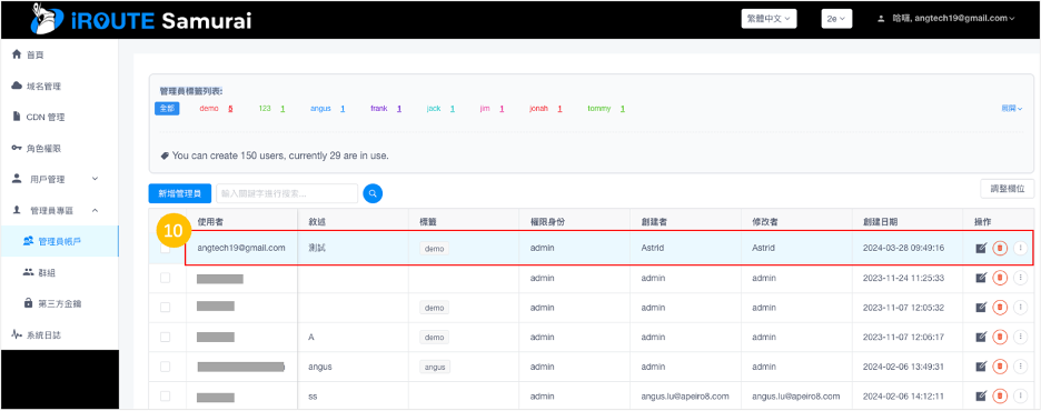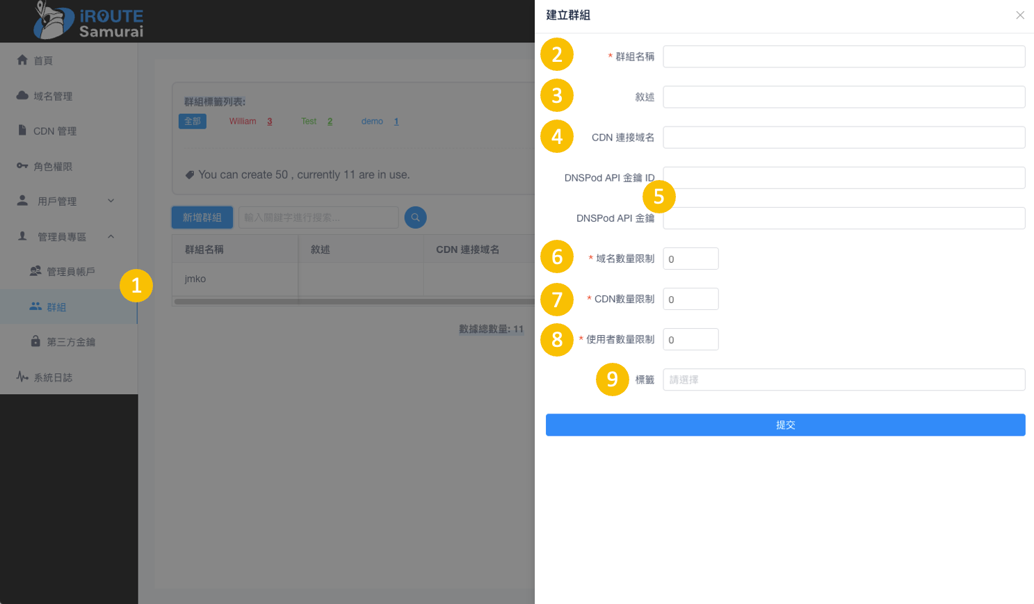 「群組」這裡可以針對群組進行新增、刪除、修改CDN連接域名、修改DnsPod金鑰相關、域名、CDN、該群組使用者數量的限制,唯該數值上限取決於「第三方金鑰」中給予的上限數。