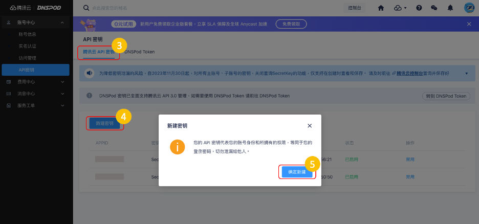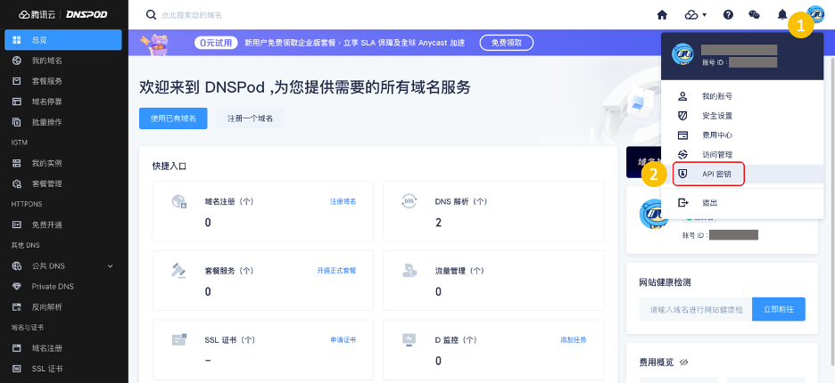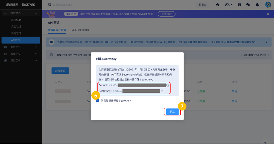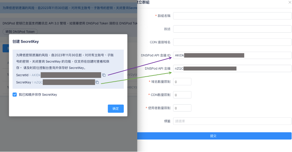 如果您使用自己控管的DNSPod帳戶,需要填入的詳情資訊請見下圖,取得API密鑰後,將[SecretId]填入[DNSPod API 金鑰 ID]欄位,[SecretKey]填入[DNSPod API 金鑰]欄位,以完成設定。