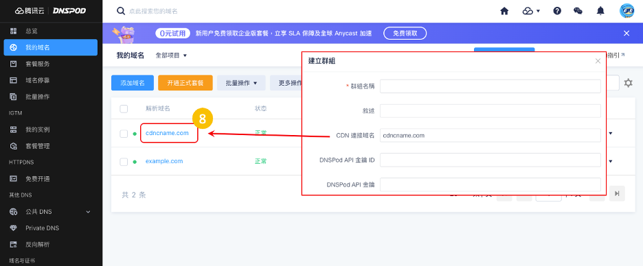 ④ CDN 連接域名:指新增在這裡的域名要被指向時加上的CNAME域名,例如這裡設定 cdn123.com,屆時使用者新增一筆 [www.example.com],CNAME就需要設定為 [www.example.com.cdn123.com] 的指向,這筆域名也要事先將NS紀錄建立並指向在您的DNSPod平台上。 (如下圖)
