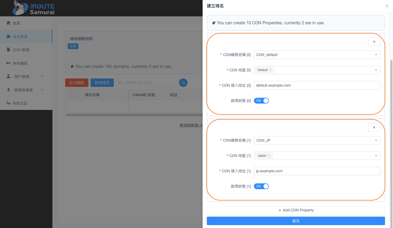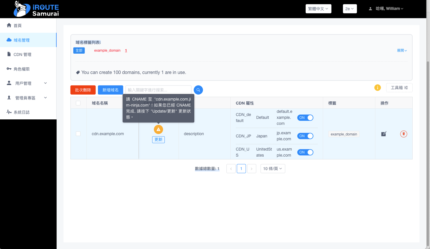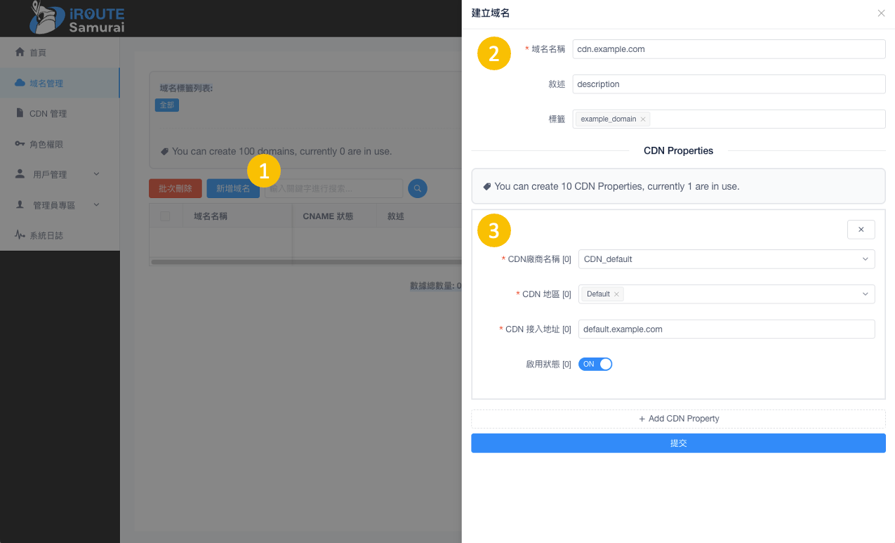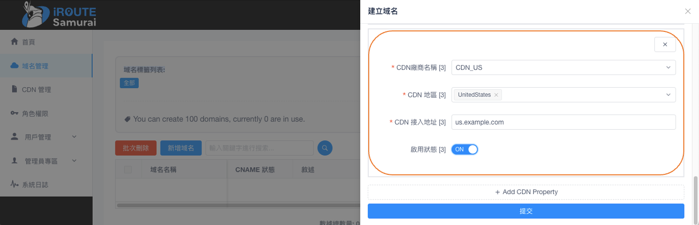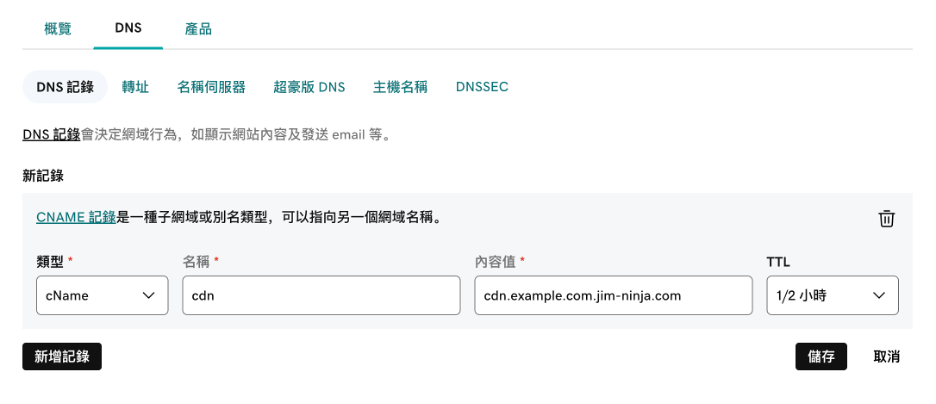 新增一筆域名cdn.example.com為示範: