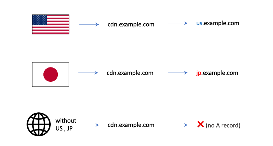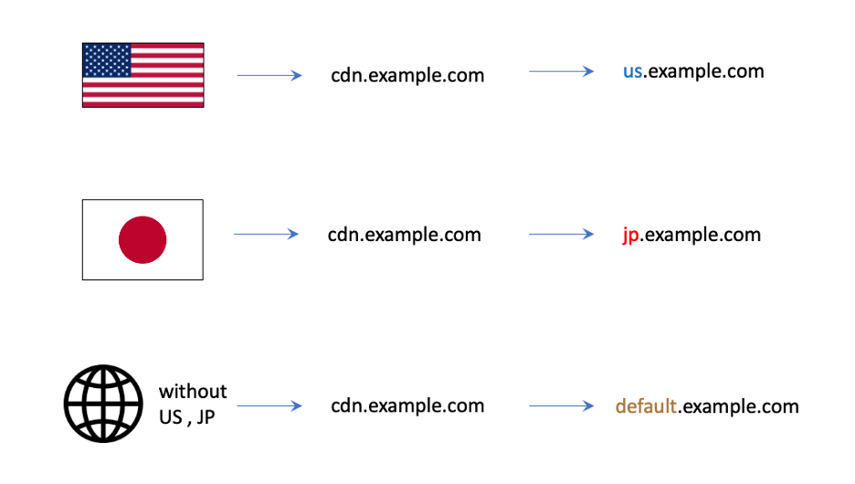 例如進行如上設置,訪問cdn.example.com時,來自日本的訪問就會至jp.example.com、來自美國的訪問就會至 us.example.com、來自日本和美國以外的其他地區訪問就會至default.example.com。