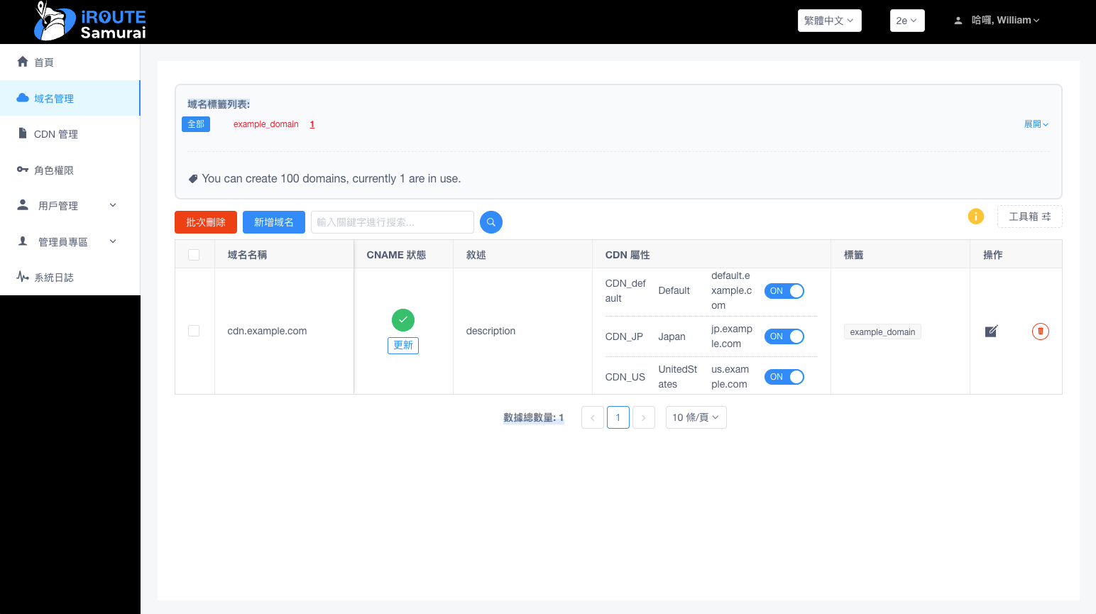 在域名管理欄位中點選「新增域名」,即可開始將域名套用在iROUTE SAMURAI上。