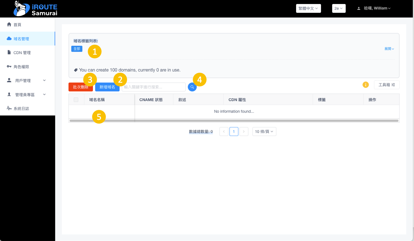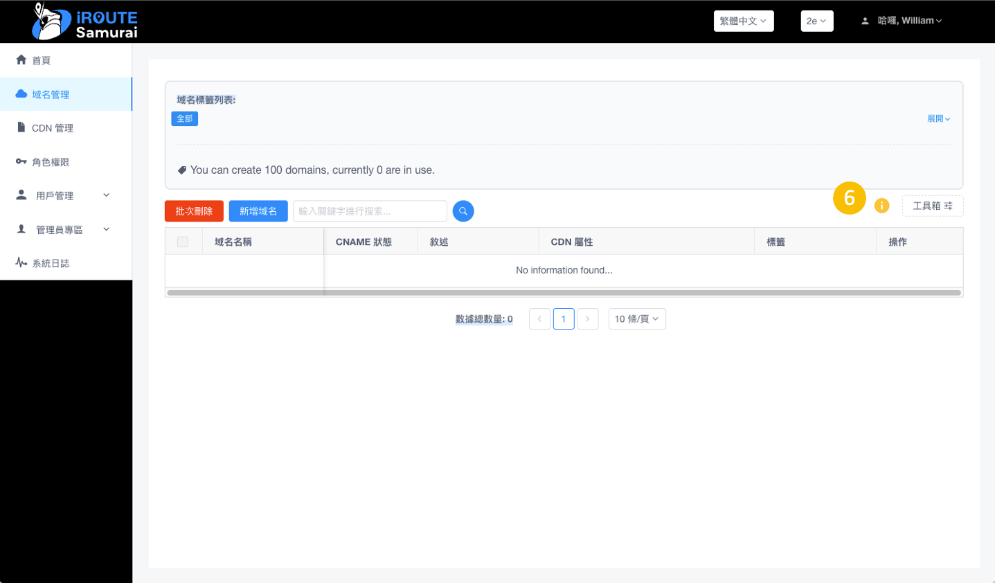 點選搜尋按鈕可以找尋您想要的域名。該欄位是模糊搜尋,只需要輸入部分關鍵字即可搜尋到相關資料。