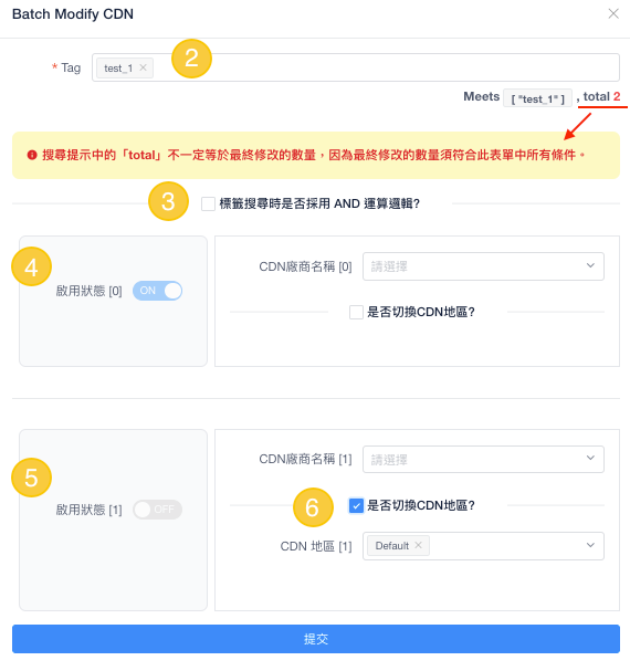 ⑥ 若需同時修改 CDN 地區,請勾選此選項,勾選後將顯示可填寫地區的欄位。